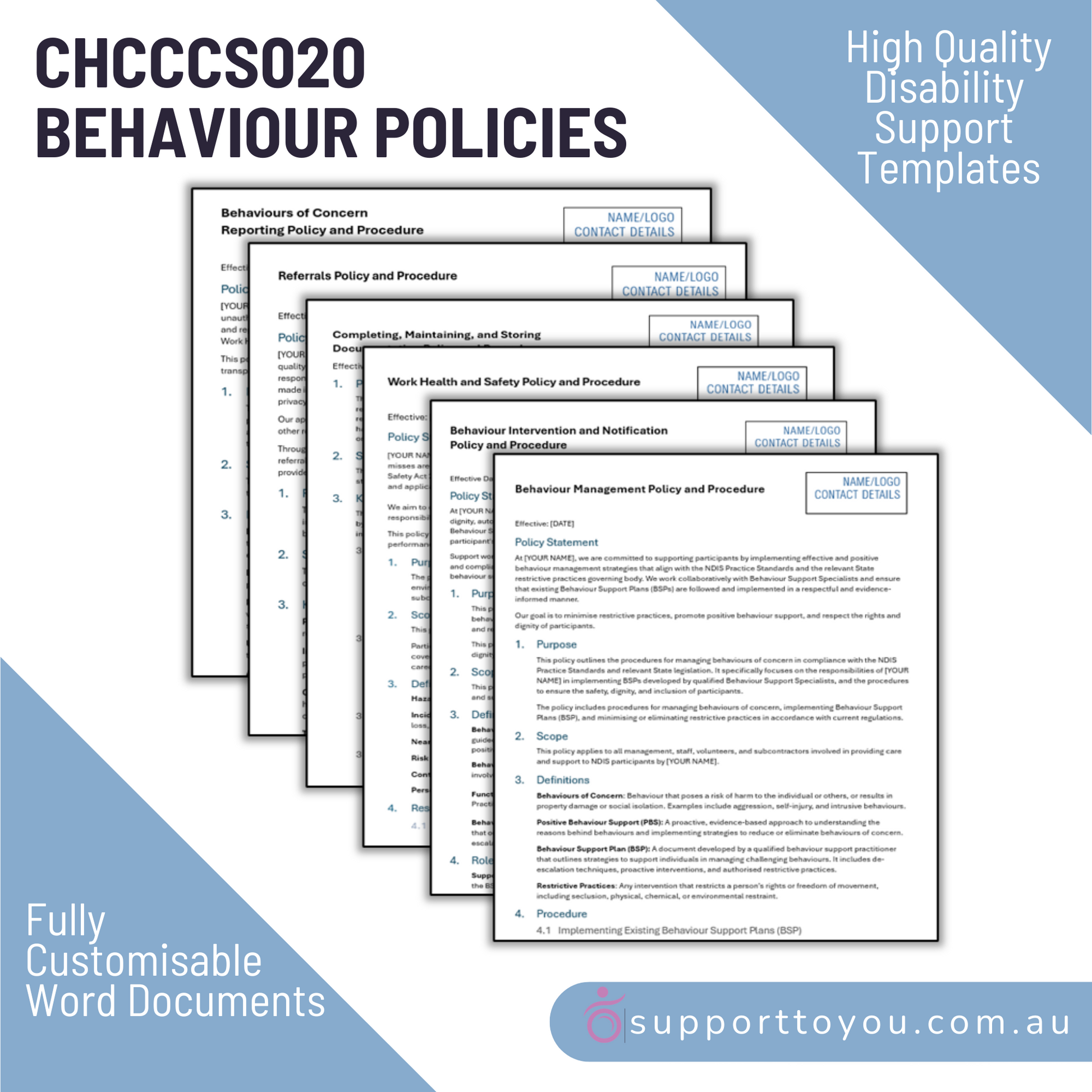 Complete your CHCCCS020 assessment with our bundle of Policies and Procedures, specifically designed for students studying Respond Effectively to Behaviours of Concern, this bundle provides the policies you need to complete your course assessment requirements.