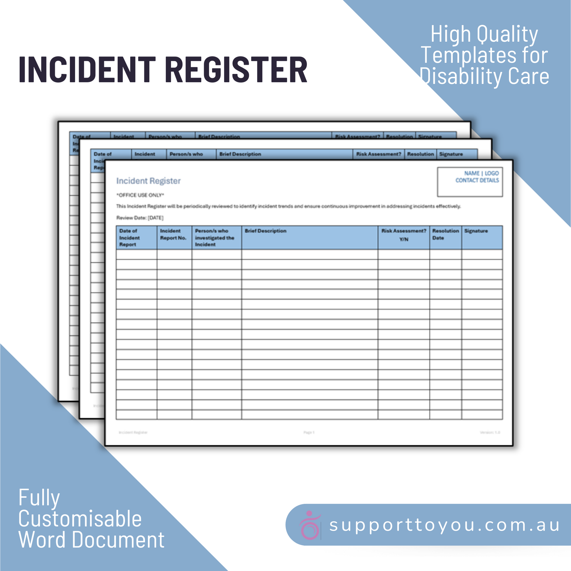 ✅ Incident Register – A central record-keeping system to log all incidents, track trends, and support continuous improvement in service delivery.